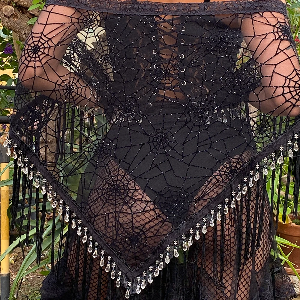 Black spiderweb Goddess Shawl ~ with black fringe, black lace & black beading ~ perfect for spooky szn!