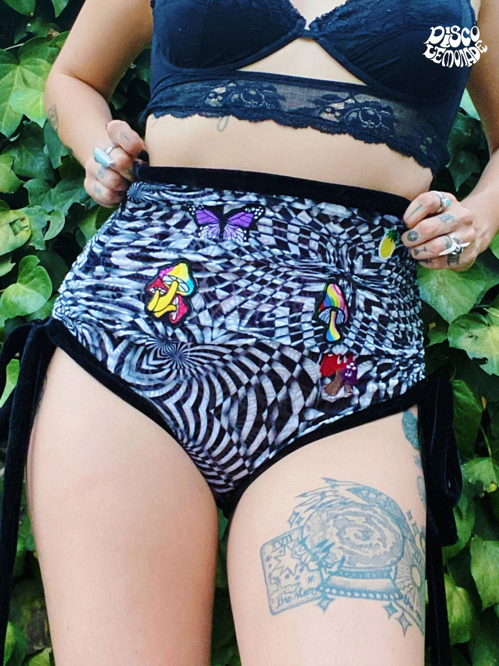 One of a kind burnout velvet psychedelic scrunch shorts with mushroom embellishments.