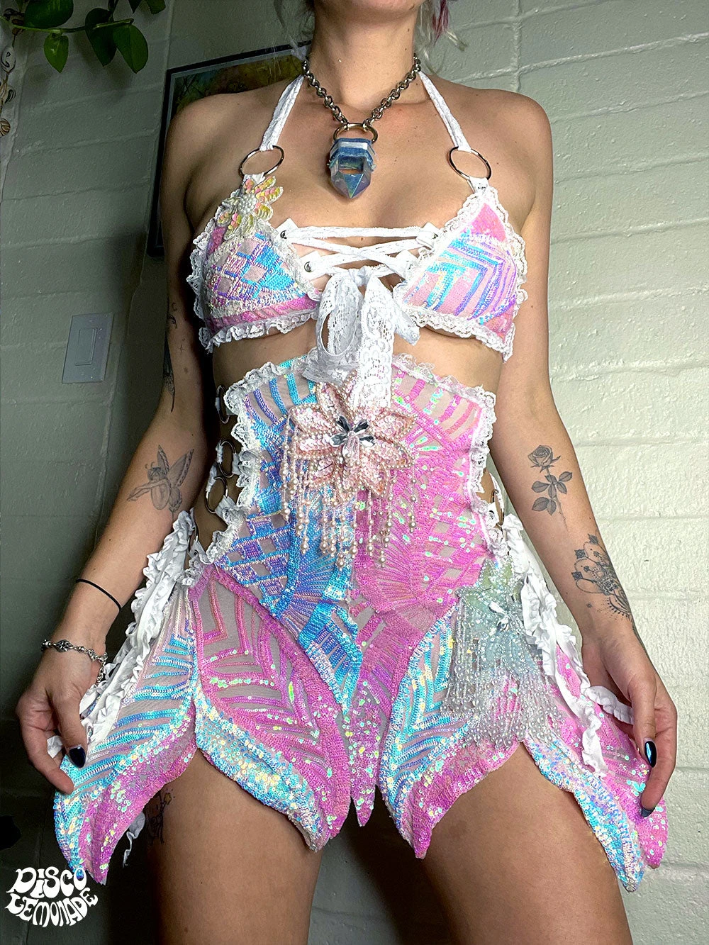 Ice on 4 way stretch nude mesh collaged on baby pink sequin on pink mesh hardware Disco dress with white ruffle detailing, o ring design, and beaded sequin embellishments.