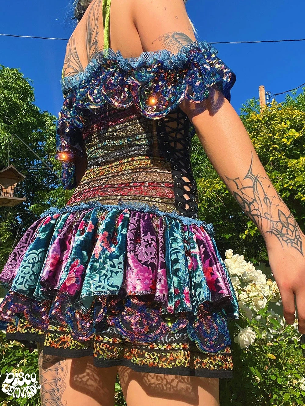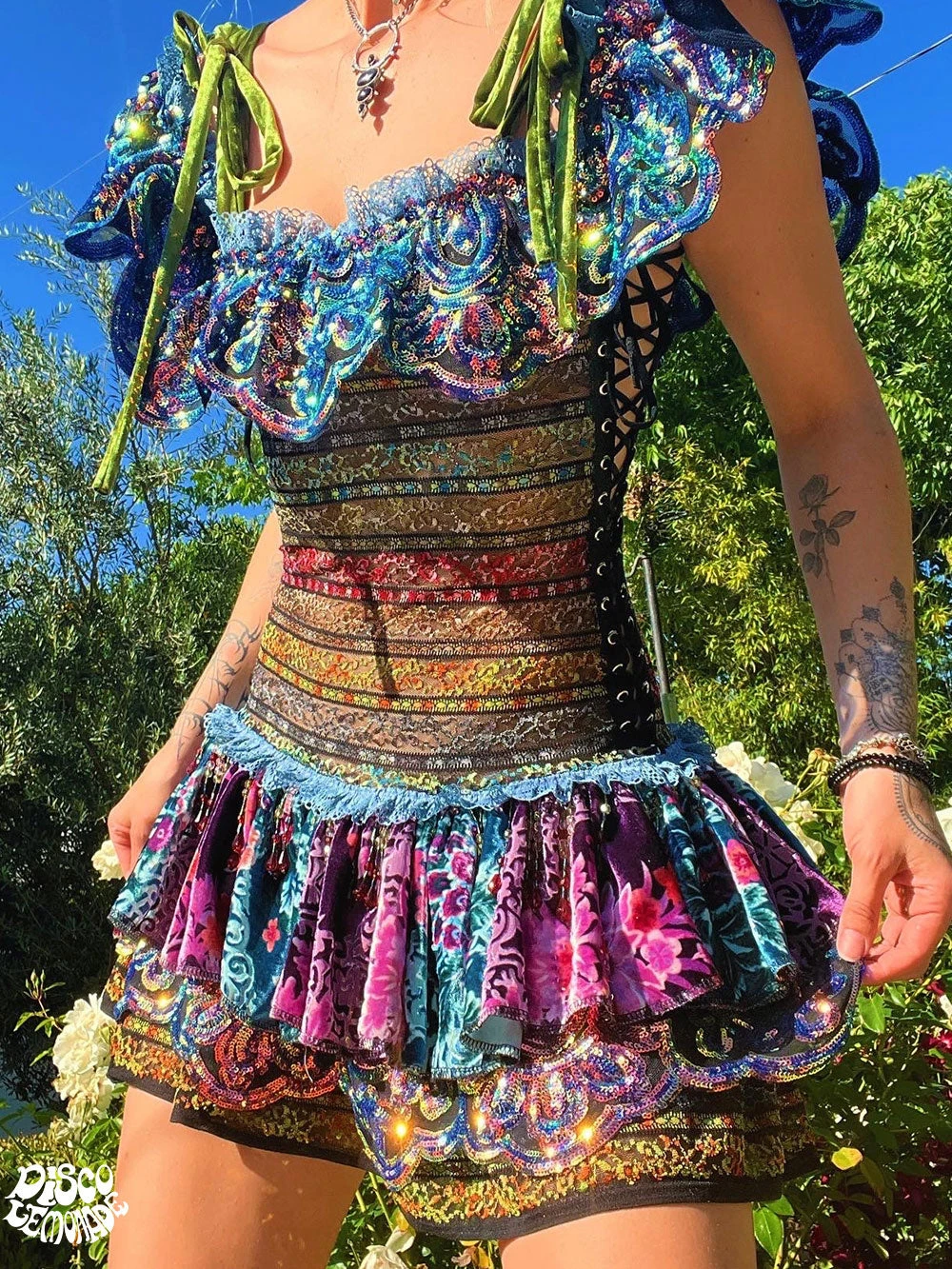 Iridescent radiant ruffle dress with lace up elastic on sides for an adjustable fit. Ruffle can be worn over arm or around shoulder. The ruffle skirt is high quality silk patchwork with 4 way stretch lace & 4 way stretch sequin on mesh.
