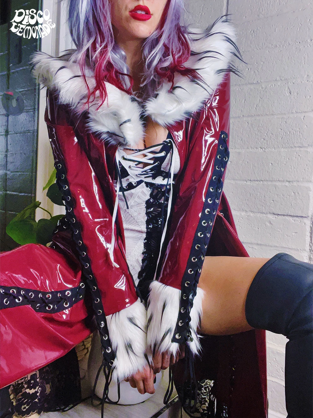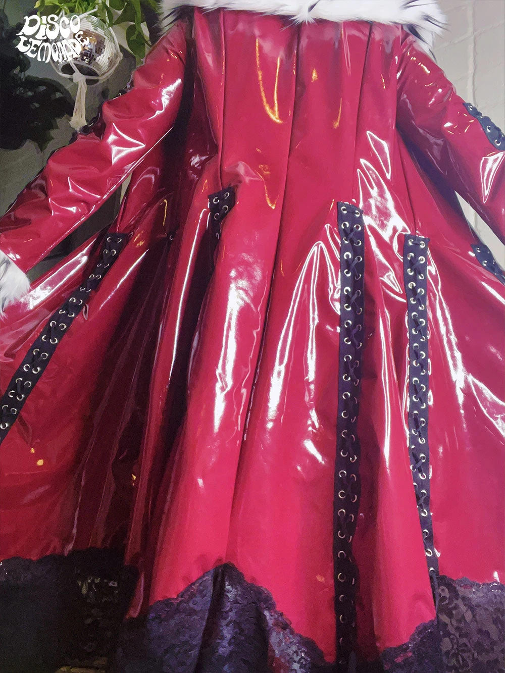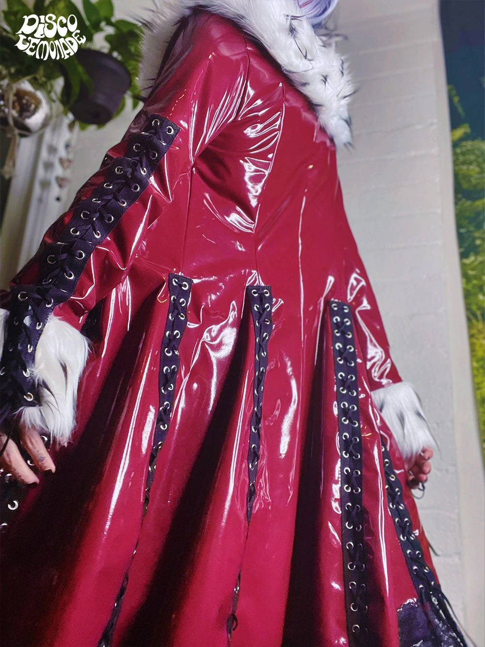 Faux latex with black lace up accents & a fur collar/cuffs.