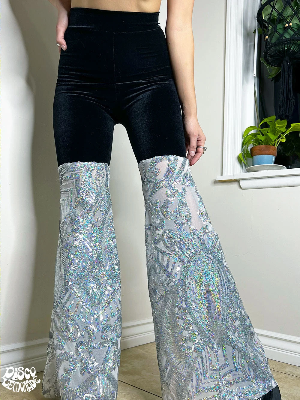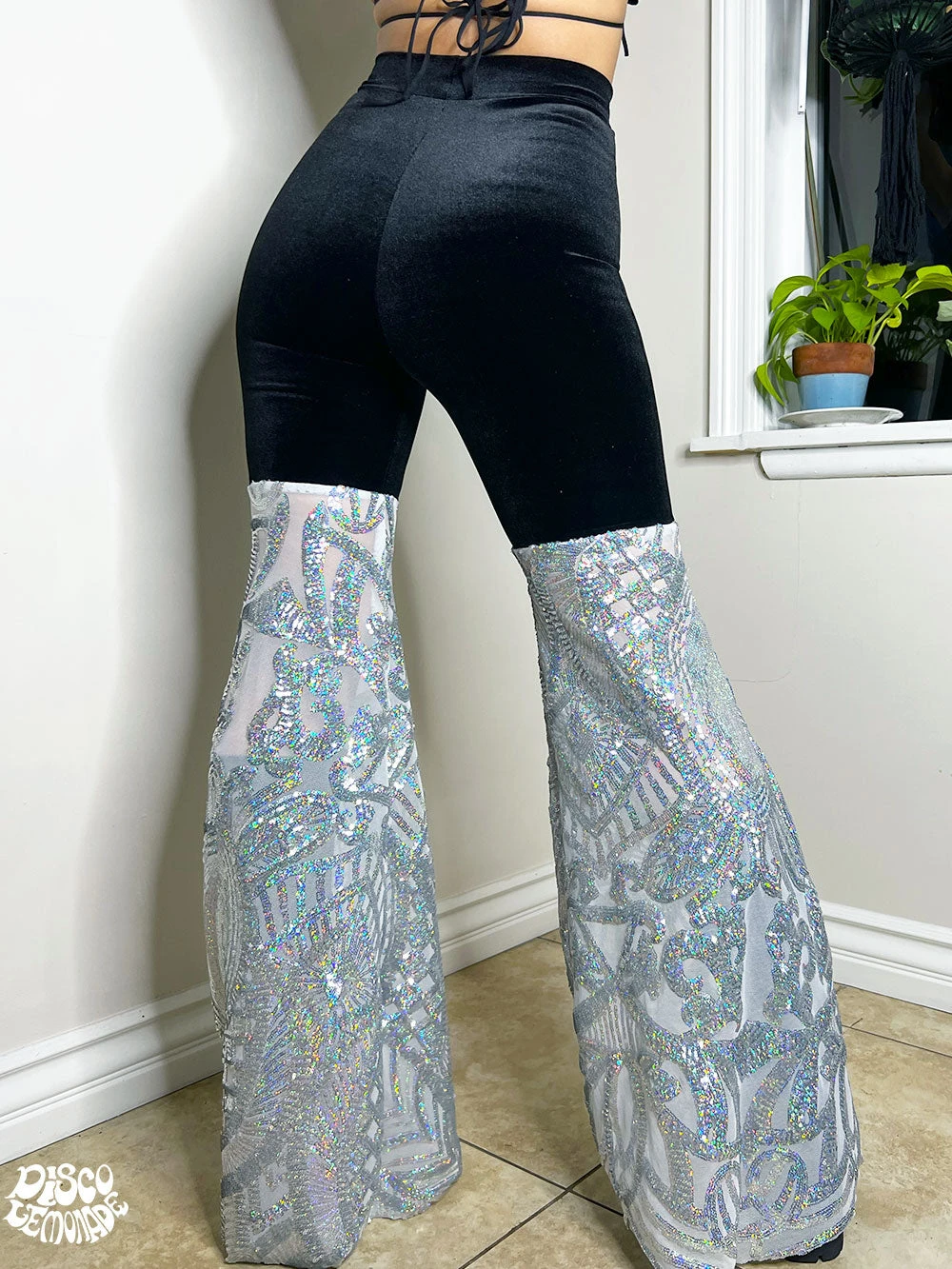 Matte green velvet with big blue/green Oceanlab sequin bell bottom on 4 way stretch black mesh.