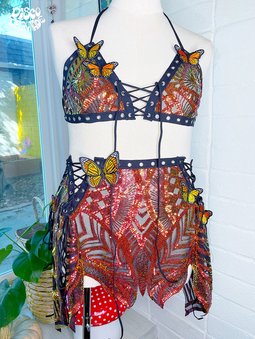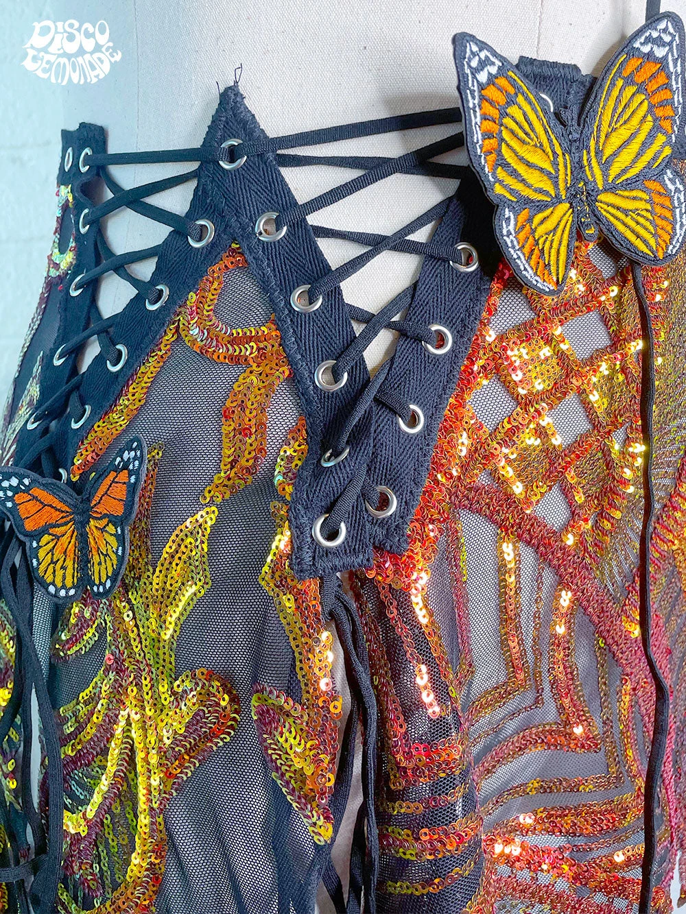 Iridescent fire sequin on 4 way stretch mesh with monarch butterfly embellishments.