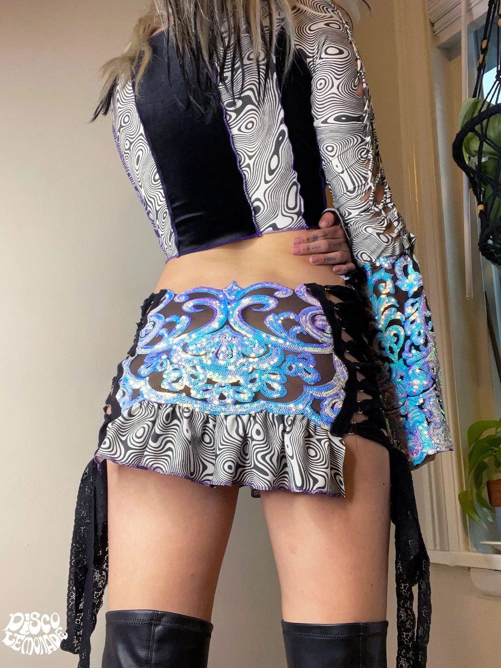 This one of a kind Disco Set comes with signature patchwork psychedelic braided top by Astralvisions Designs with a disco bell sleeve. The set comes with a mini fairy sequin on 4 way stretch mesh Disco Skirt with an astral ruffle flair! Adjustable with lace ups on side of skirt.