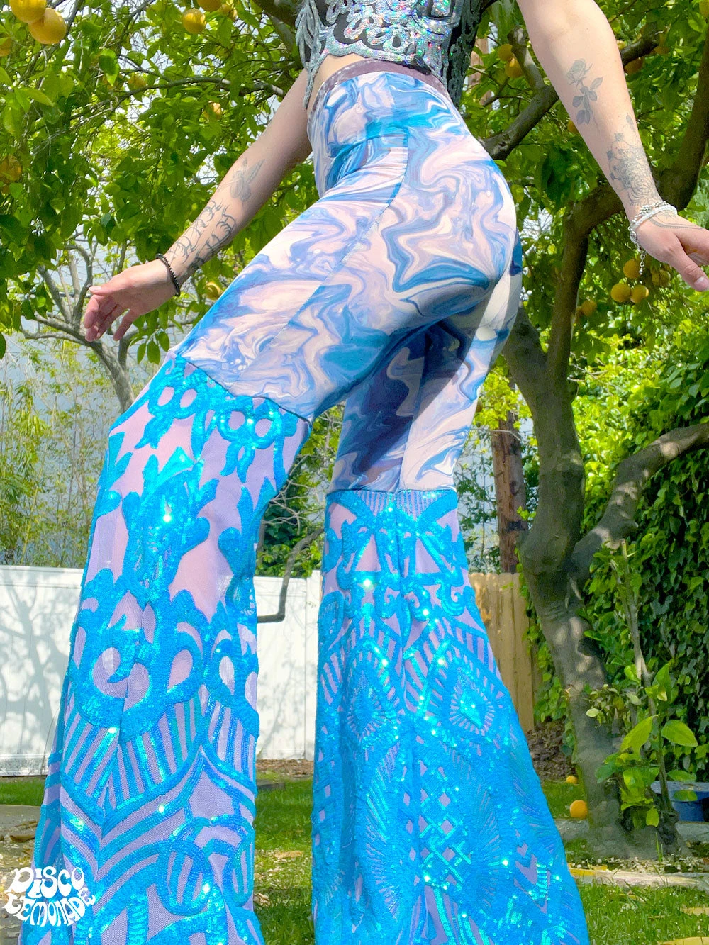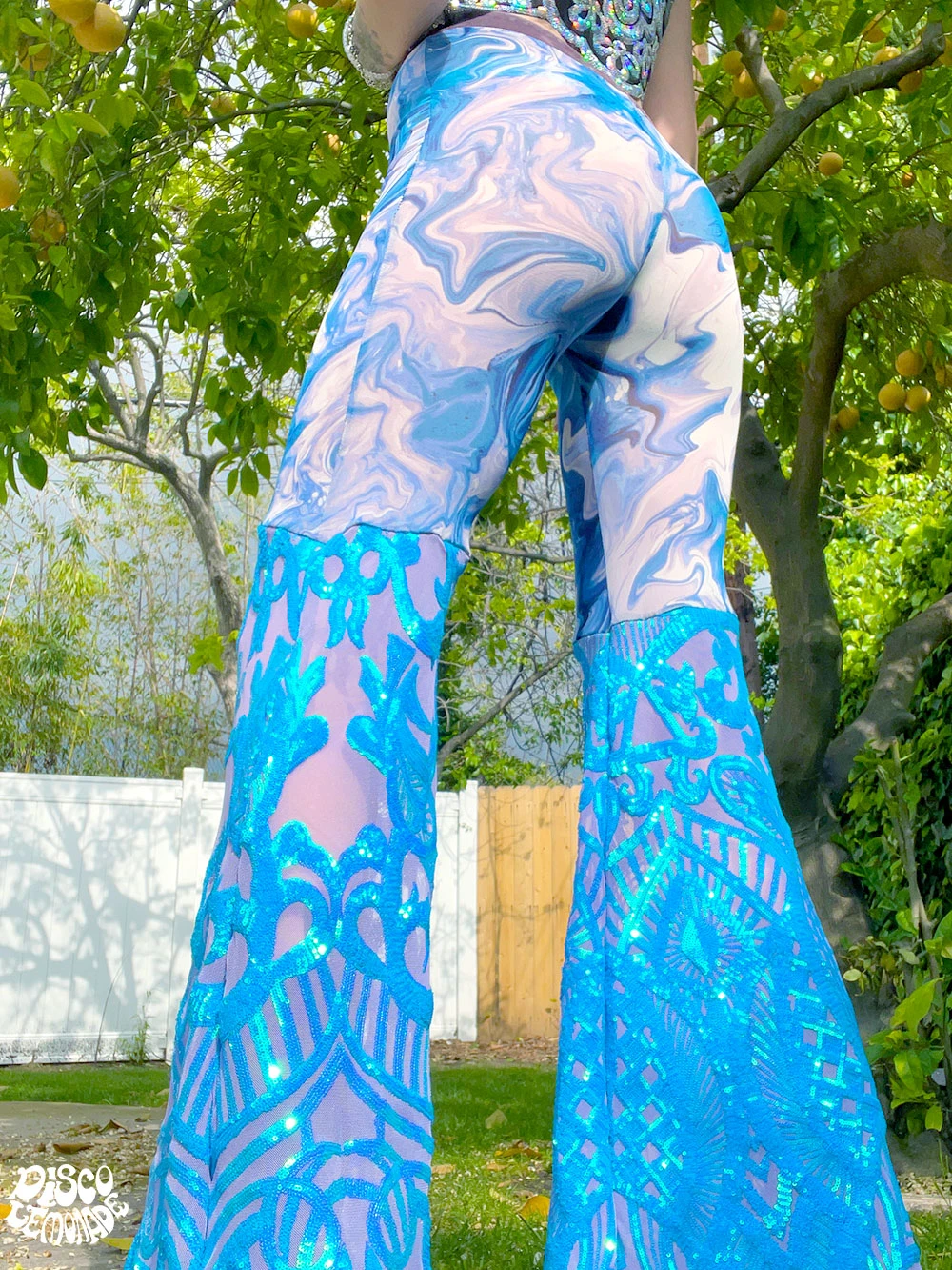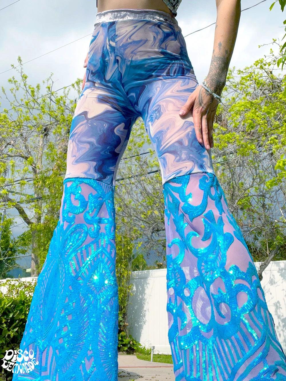 Blue/purple swirl mesh with purple/blue sequin on 4 way stretch mesh bell bottoms.