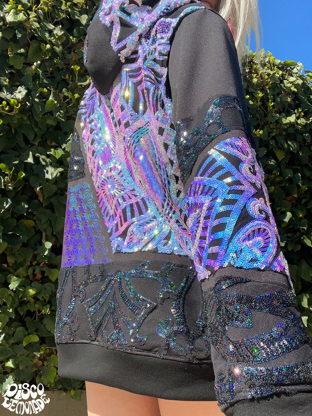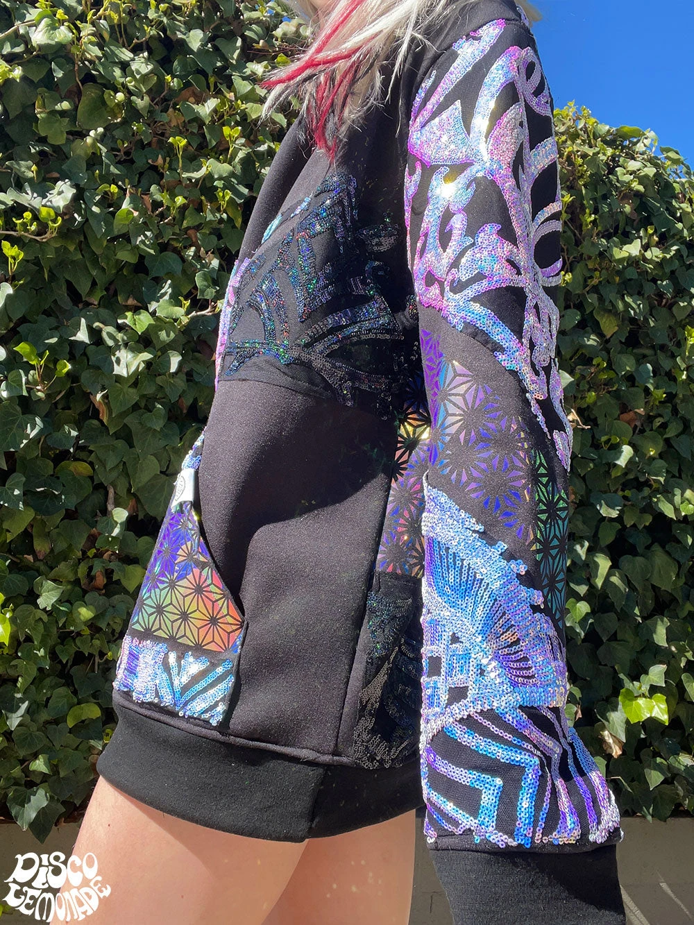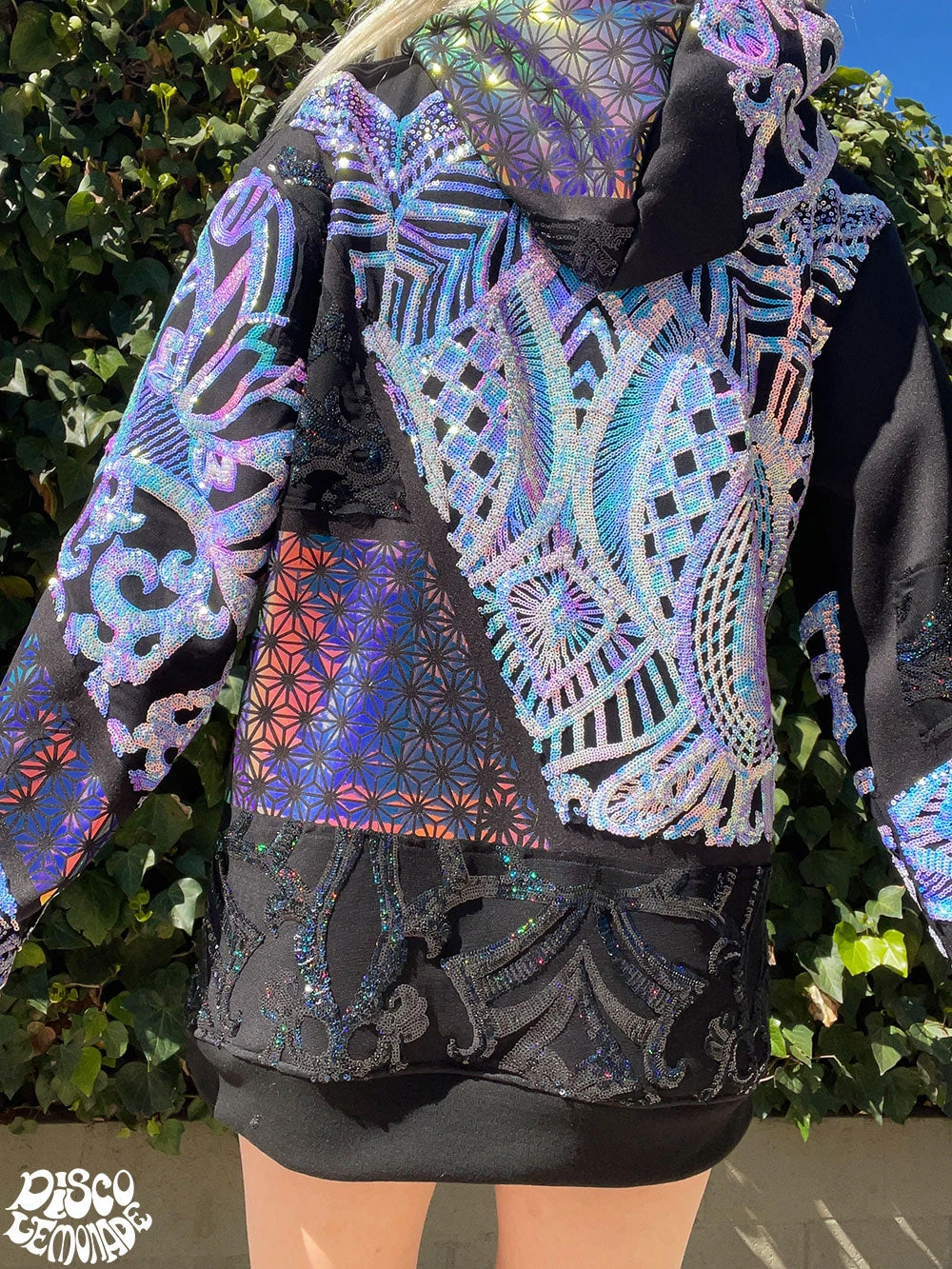 Comfy hoodie with sequin and vinyl detailing.