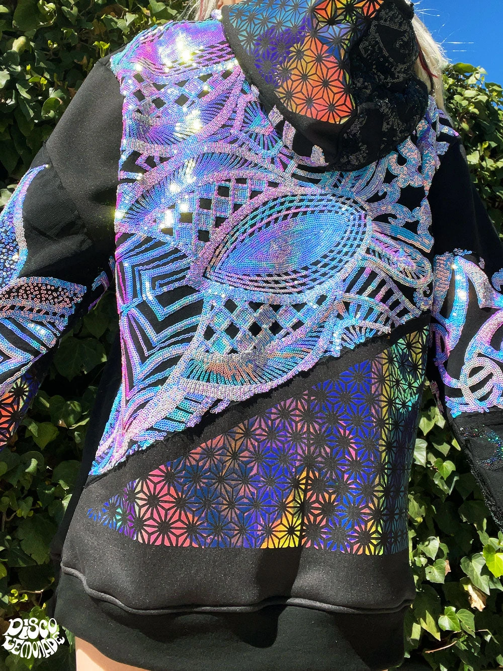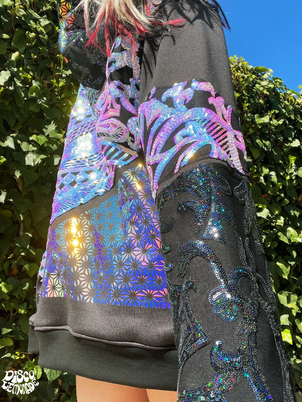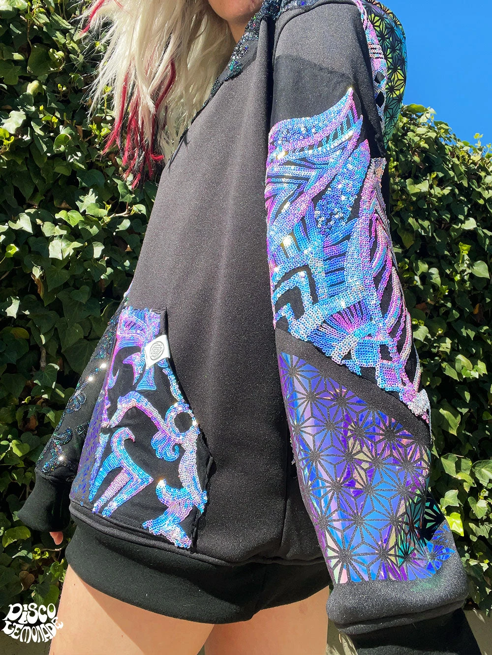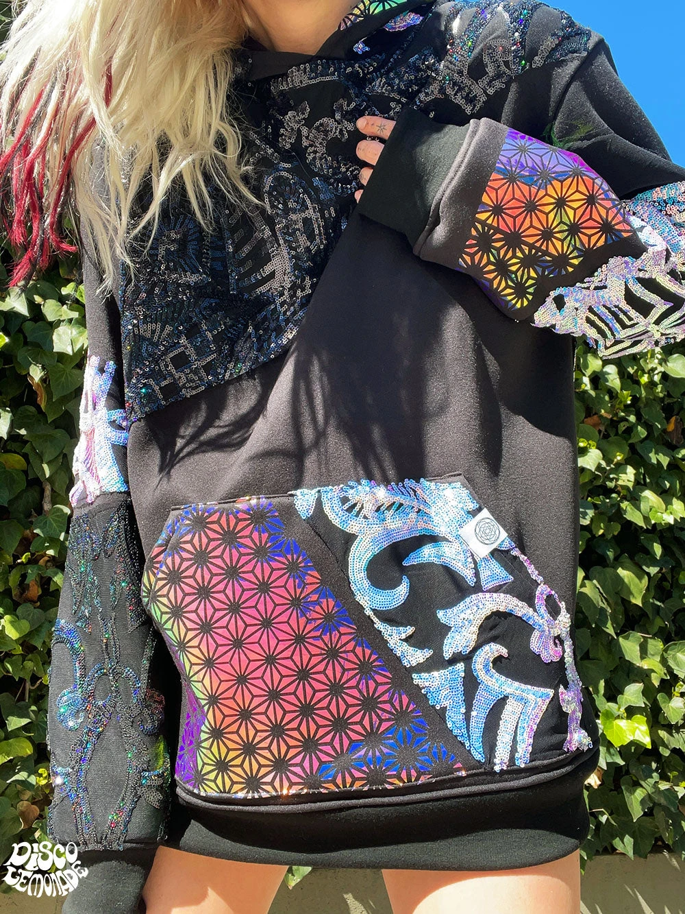 Comfy hoodie with sequin and vinyl detailing.